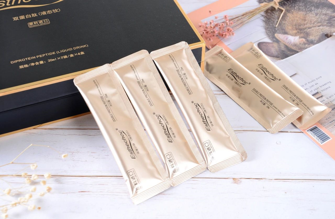 Esthechoc胶原蛋白液态饮,是与英国剑桥生物医学实验室合作研发的一款产品,其利用定向裂解技术从深海鲑鱼体内分解出低于1000道尔顿的小分子胶原蛋白肽,解决了传统胶原蛋白分子太大无法被人体吸收的问题。